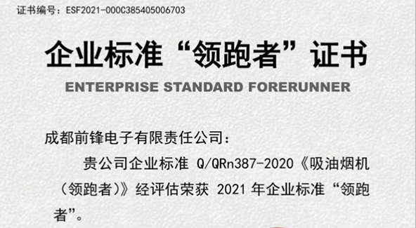 近日,由中國標(biāo)準(zhǔn)化研究院主辦的《2021年全國企業(yè)標(biāo)準(zhǔn)領(lǐng)跑者榜單》發(fā)布。成都前鋒電子有限責(zé)任公司生產(chǎn)的前鋒牌吸油煙機(jī)CXW-200-L803 榮獲企業(yè)標(biāo)準(zhǔn)《吸油煙機(jī)(領(lǐng)跑者)》殊榮。